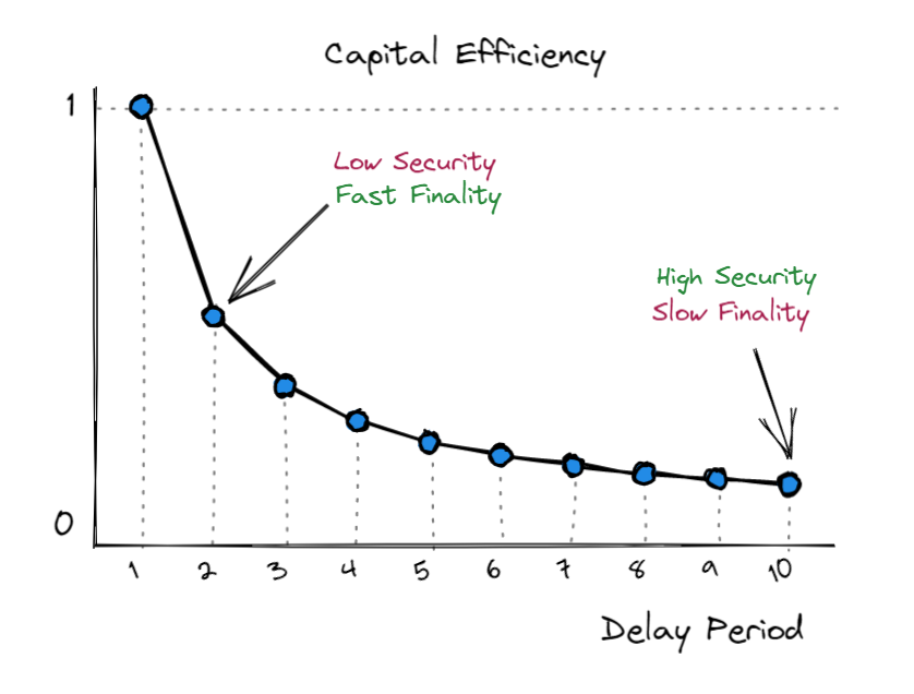 Shifting the delay period is equivalent to shifting along the Capital Efficiency vs. Delay Period curve. As the delay period moves, however, users need to consider its implications on the tradeoff between security and finality - they would be otherwise indifferent to these shifts.