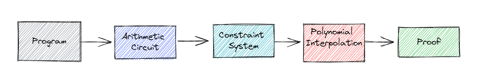 We won’t go into the technical minutiae of how ZK proof systems work now, but here’s nice a diagram that illustrates how we get from a smart contract to something resembling a proof that can be verified efficiently.
