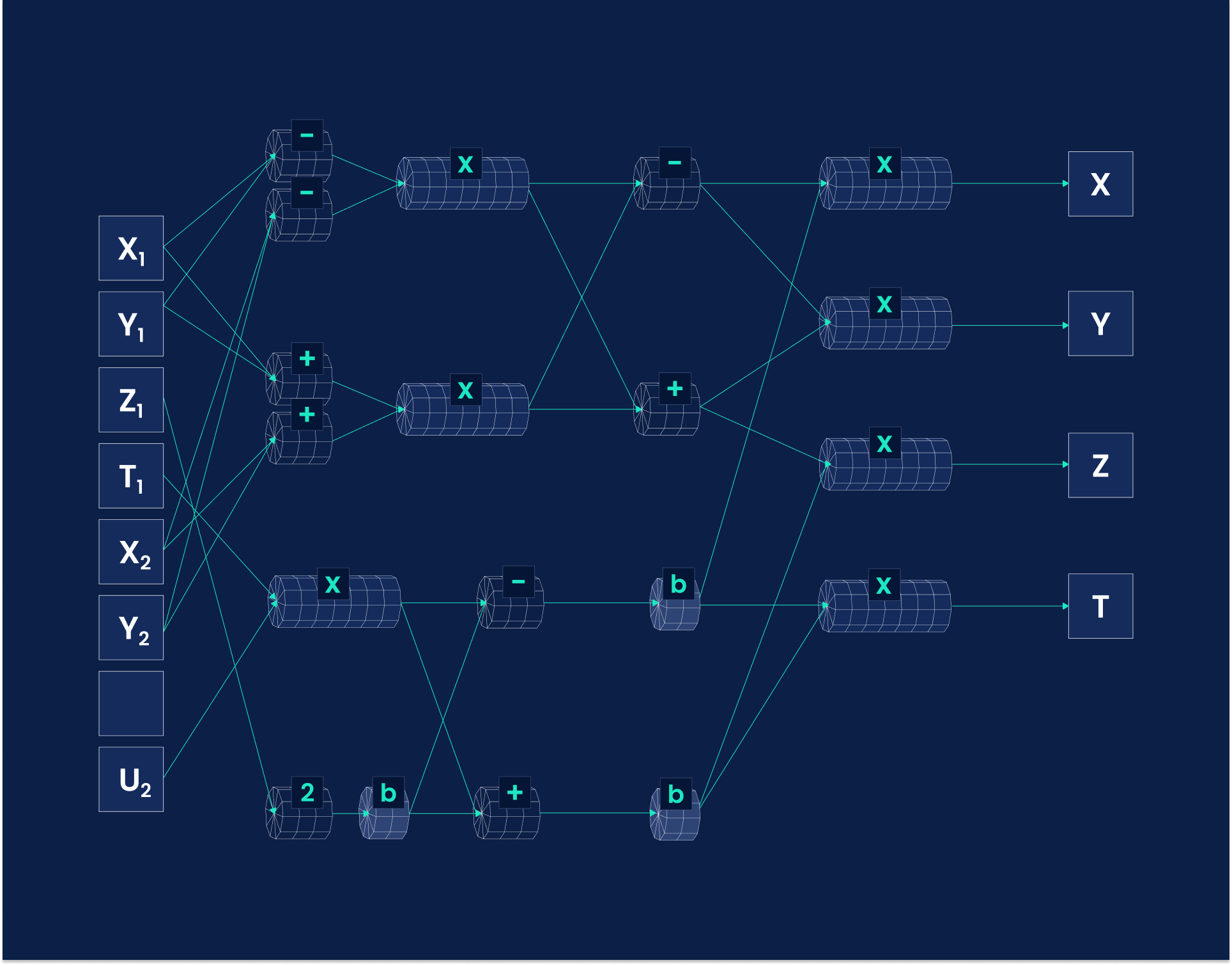 Our pipeline implements addition in extended Twisted Edwards coordinates using seven field multipliers, as shown in the figure below.