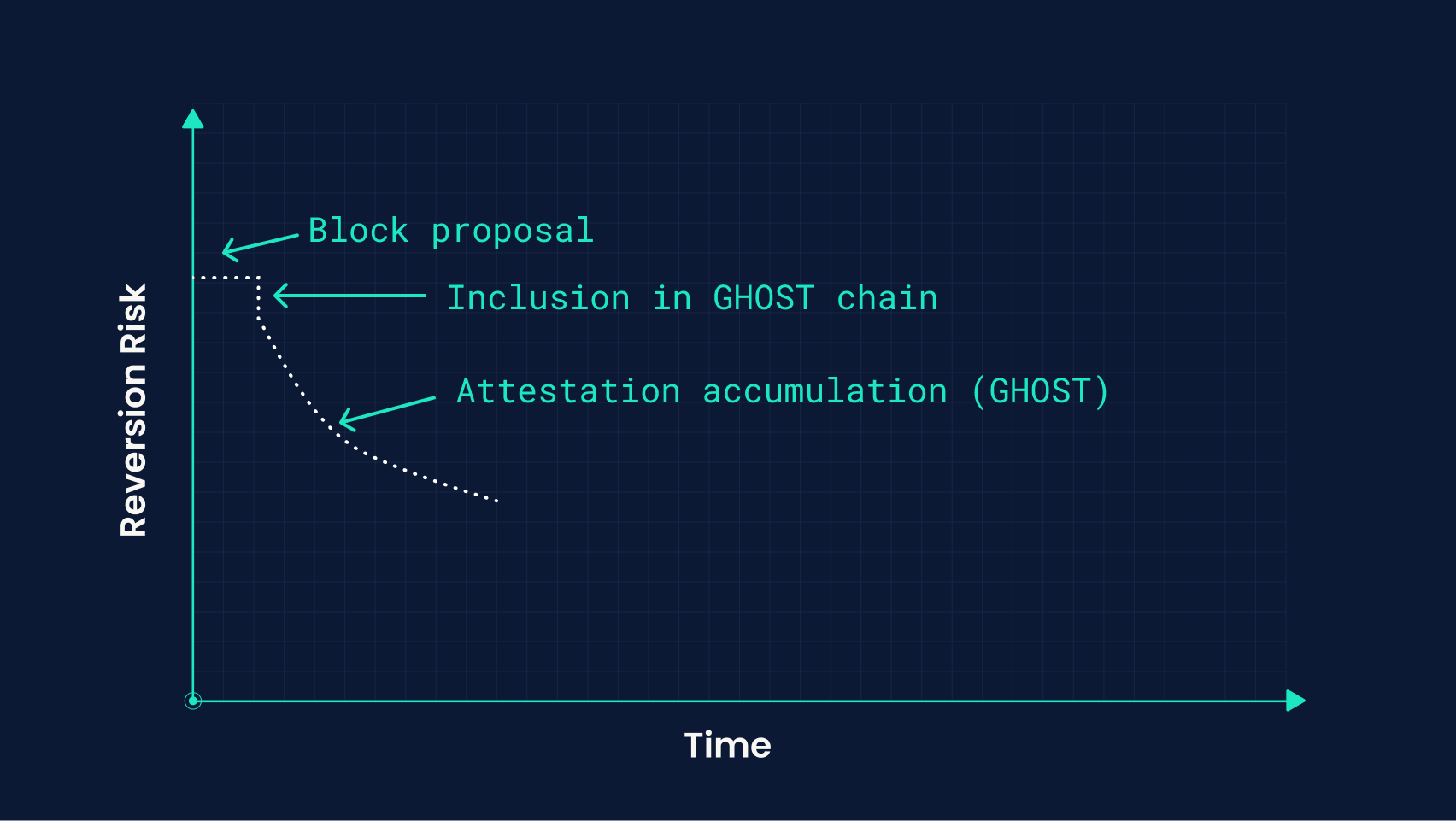 Although a fork being selected by GHOST doesn’t guarantee it can’t be reverted (it’s just a rule applied to our local view of the chain), as the subtree rooted in our block of interest accumulates attestation weight, we can increase our confidence that it will eventually be finalized down the line, roughly analogously to how we count the number of block confirmations in Nakamoto protocols, which we explored in our last post.