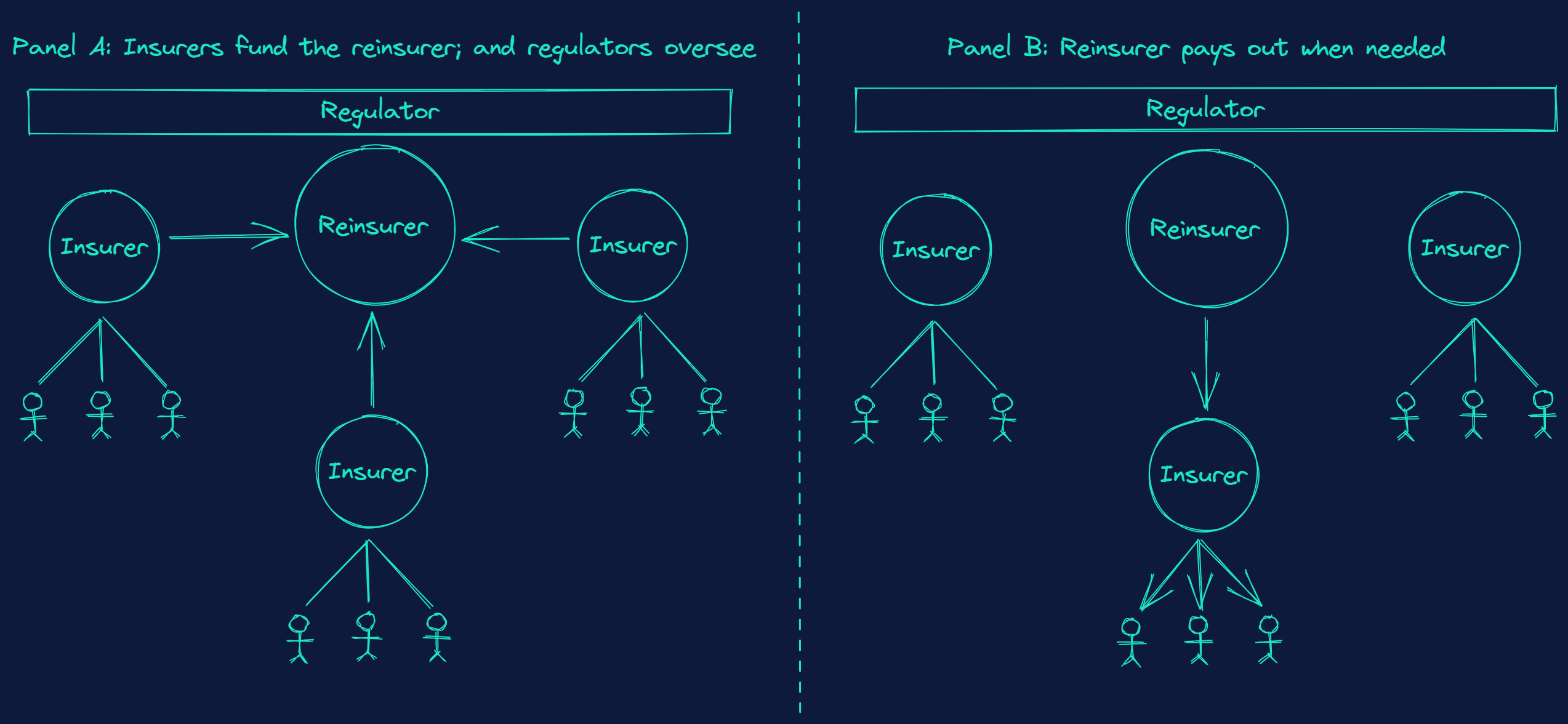 The informational aspect is more subtle but just as critical. Under this model, the cognitive burden of assessing a pool’s risk shifts from the insurance-naive (consumers) to the insurance-savvy (other insurance pool operators). Now, consumers only assess whether an insurance pool participates in a reputable DERP or not, as a measure of riskiness. Existing pools in the DERP — whose managers have better understandings of insurance risk — assess the new pool in granular detail and set customized premiums based on the entrant's riskiness. This removes the incentive for irresponsible pools to maximize risk and rewards responsible pools with lower premiums.