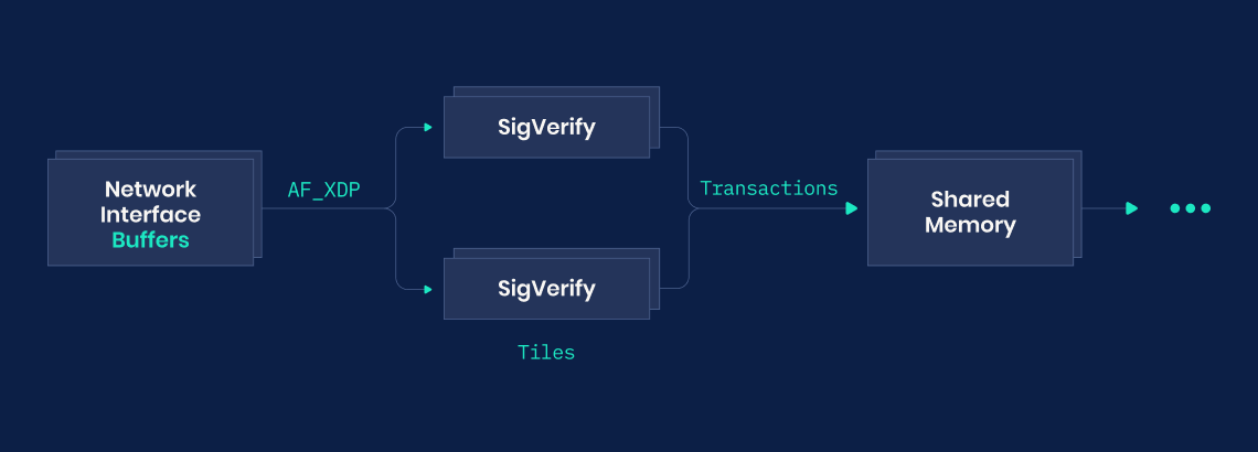 Firedancer introduces a novel message-passing framework for composing an application from highly-performant C “tiles” – faster than the Linux kernel allows. Therefore, we bypass kernel networking using AF_XDP, allowing Firedancer to directly read from network interface buffers.