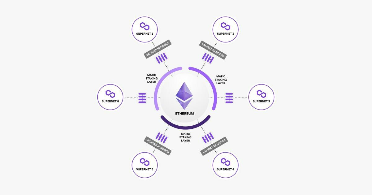 - PoS: This follows traditional PoS architecture, where any network participant may stake tokens to become a validator. Validators are reward in network tokens and slashed for malicious behavior. Unlike other frameworks we have seen thus far, all shared security supernets have the same set of validators, where each validator must stake MATIC on Ethereum in order to participate in consensus on the supernets, and are paid in MATIC for non-malicious participation. While there is no concept of a shared global state, as in Polkadot, shared security is derived from the fact that each Polygon supernet shares the same validator set.