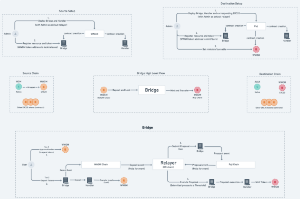Zmust not exist in any account in the current state of the sending chain before it can be a part of the next state transition of the receiving chain. Therefore, when there is a user request to transferZfrom X chain to C chain for example, subnet validators must first agree to burnZon X chain and subsequently mintZon C chain. This process is made easier by the fact that it is the same set of validators contributing to consensus on all chains within the subnet. - Cross-chain transfers across different subnets: Cross-chain transfers become more challenging across different subnets since the validator set is no longer the same. In this case, external bridges with third-party relayers become important. Current Avalanche architecture has a module to deploy bridges between multiple subnets. Each instance can be customizable as either i) burn and mint OR ii) lock and mint. Unlike, single subnet transfers, this relies on a third-party relayer to observe the burn or lock on the sender chain and relay this message to the receiver chain to initiate the mint. Here’s an overview of an instance of an implementation to bridge the WAGMI and Fuji subnets:
