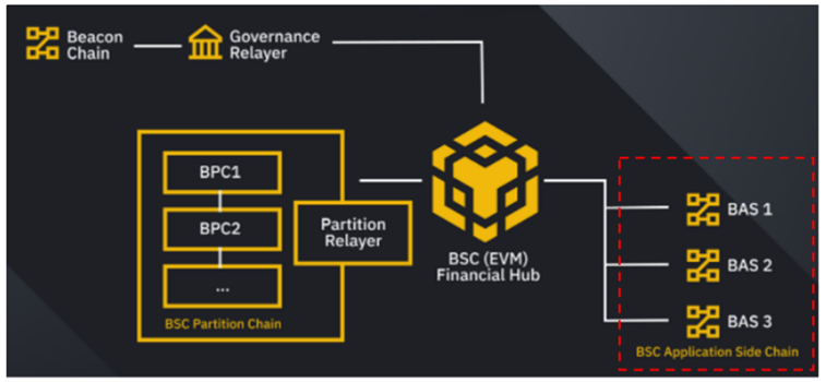 Binance Application Sidechains (BAS) is BSC’s modular framework for application specific blockchains. The initial version of BAS is expected to be a series of PoS side chains with between 3-7 validators, depending on the level of security required by each chain. BAS chains are the only application specific blockchains covered in this piece that are expected to share neither consensus nor state, with each BAS having its own independent validator set. Association with BSC will be limited to the shared toolkit available for developers to build their own side chain, as well as the external bridges expected to connect BAS chains to BSC.