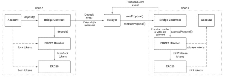 The Polygon Edge framework leverages a bridging solution called ChainBridge to facilitate communication, including but not limited to token transfers, between supernets. Similar to solutions we have seen earlier in this piece, this is how the process works in the case of token transfers: