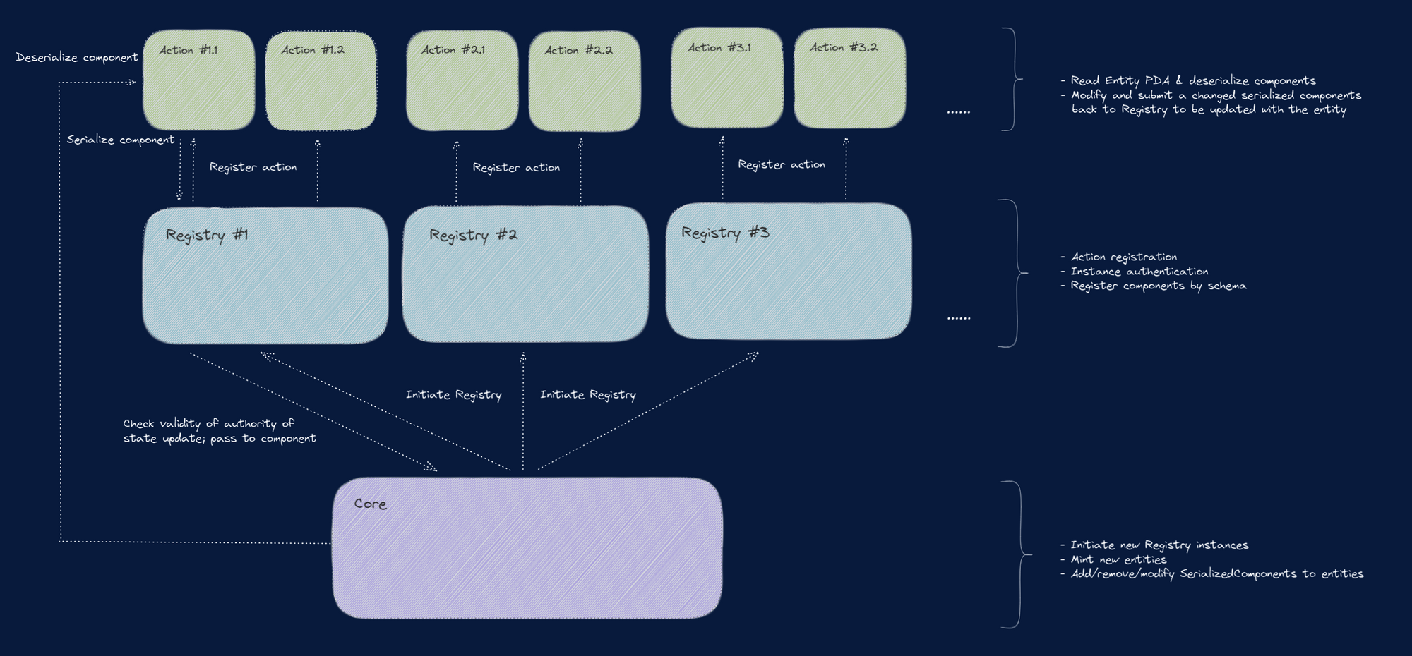 Unlike ECS, ARC has ‘actions’ instead of ‘systems’ that can execute against specific components. The primary distinction is that systems in traditional ECS are built around a loop-based architecture used in traditional games, whereas action bundles account for the fact that blockchain architecture is push-based. The specific implementation of ARC outlined here is for the Solana ecosystem, but a similar architecture could be used in other ecosystems as well. The basic structure for ARC is a three-layered onion. First, you have the Core, which is in charge of maintaining the Registries and Entities. Secondly, you have various Registry contracts, that maintain registrations for Components and Actions, along with governance features. And finally, you have the (optional) games or Actions contracts that modify components.