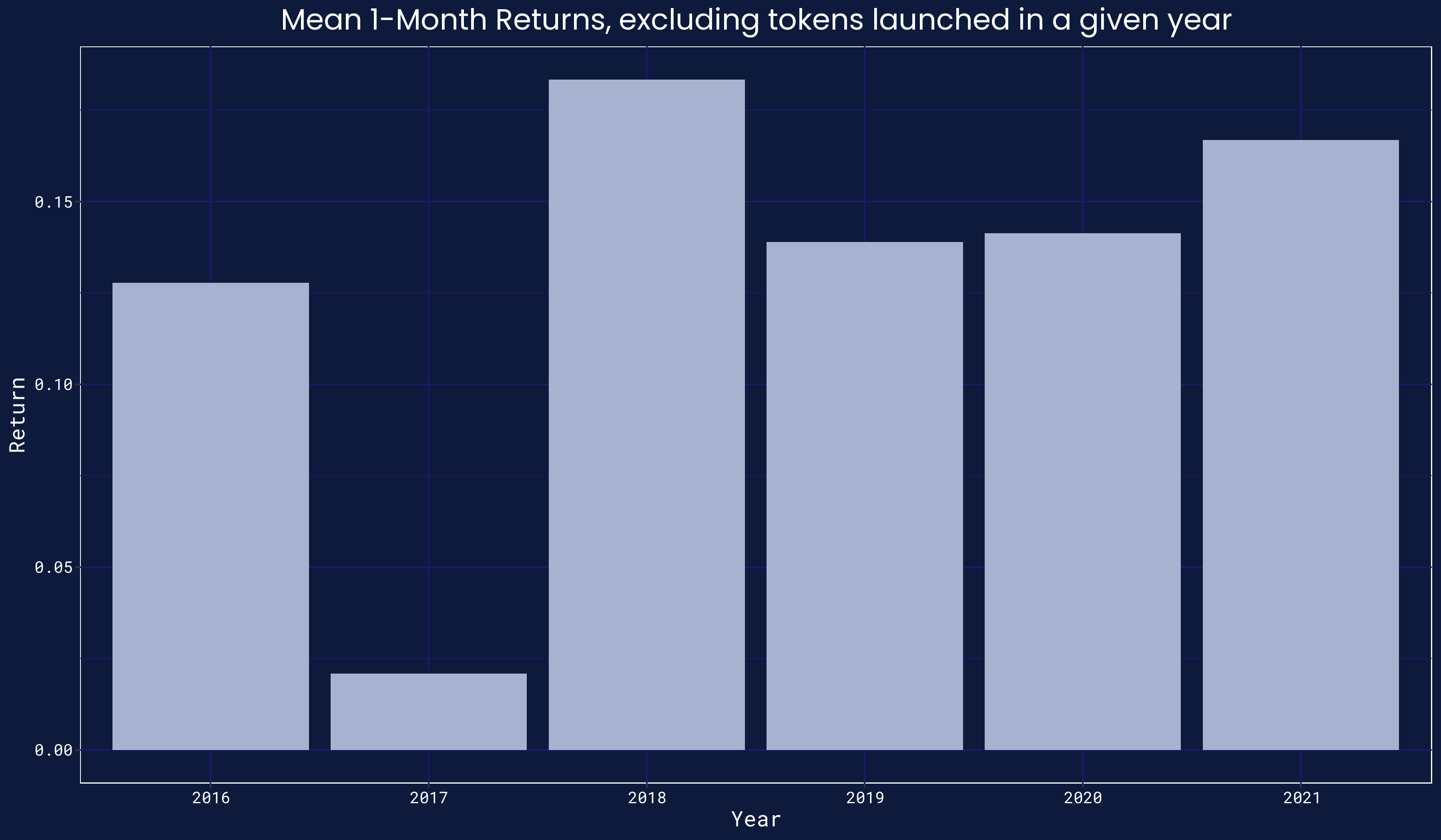 And yet, when it comes to returns for these new tokens, the answer is no — there are no systematic environment-level predictors, at least at moderate horizons. To study this, we bucket new tokens into thirty-day "cohorts," and compute a market capitalization-weighted portfolio. Per the usual approach, we then measure Bitcoin-denominated returns at the one-year horizon. As a brief aside, the most successful cohort is one in September 2015, with a single member: Ethereum. The second most successful cohort spans mid-September to mid-October 2019, which includes Terra’s LUNA token and the Celsius token (in addition to a few heavily-underperforming ones like Breezecoin).
