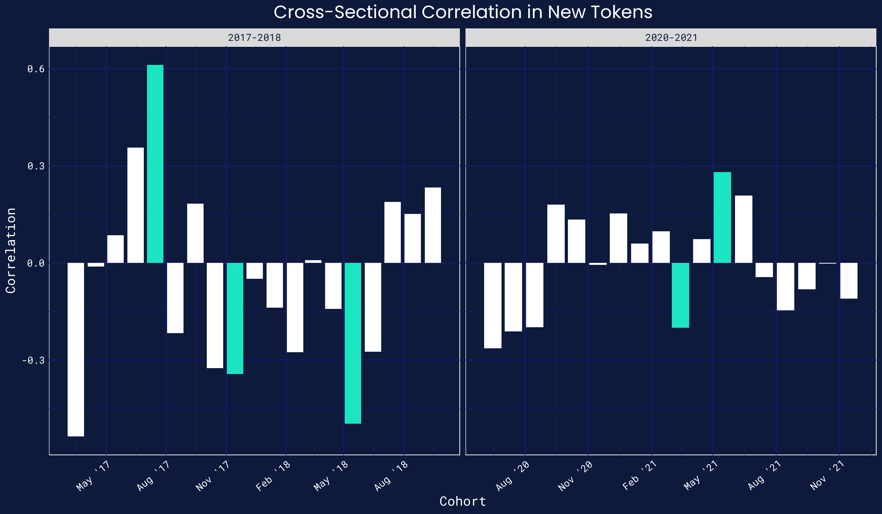 To test this, we continue to construct monthly cohorts. For each cohort, we measure the outlier-robust Spearman correlation between the cross-section of returns over their launch month and the cross-section of returns in the subsequent month. To focus on the main conclusion, we plot the correlations for the cohorts born over 2017-2018 and the cohorts born over 2020-2021. Both represent relative boom eras for crypto markets. Note that statistically-significant correlations are shaded teal.