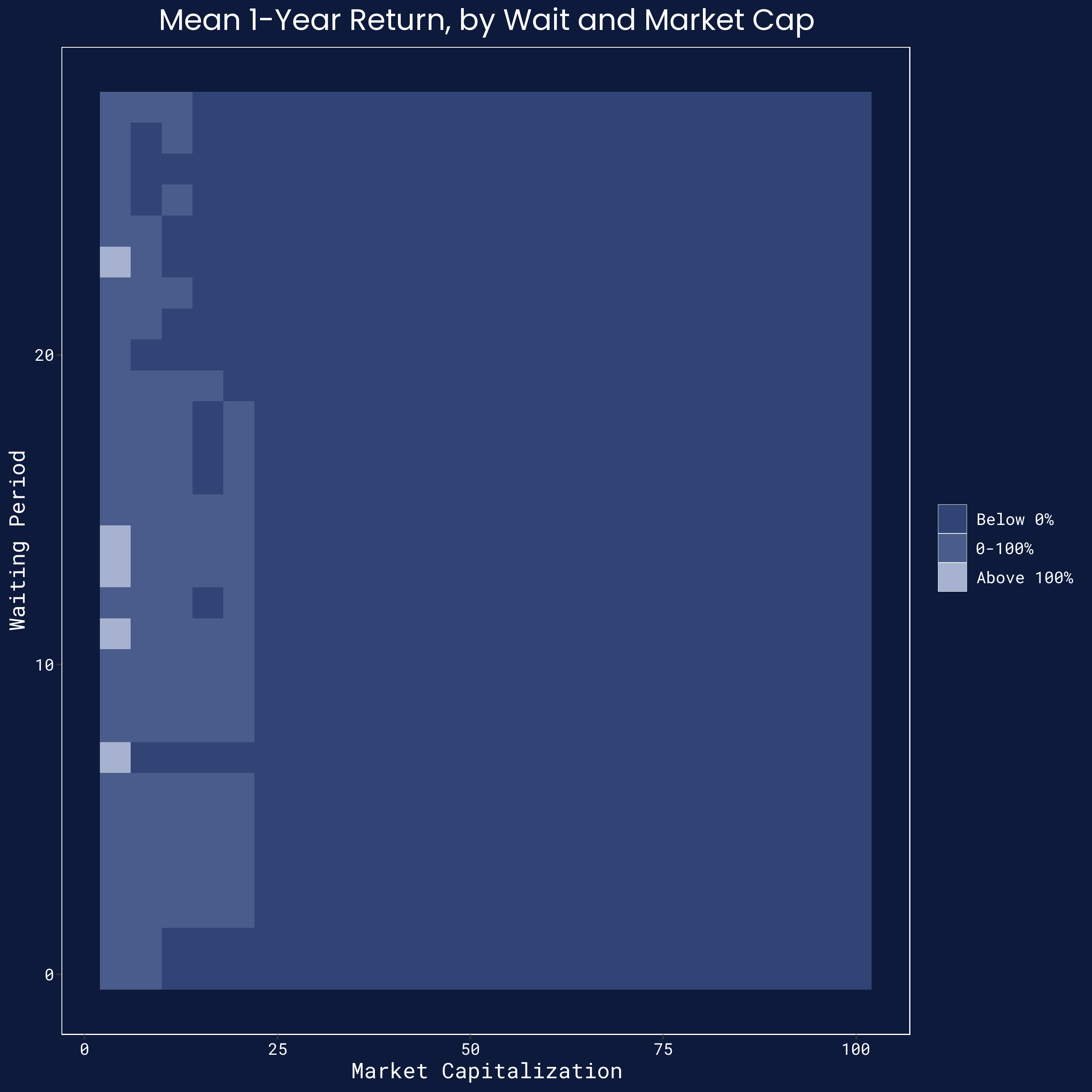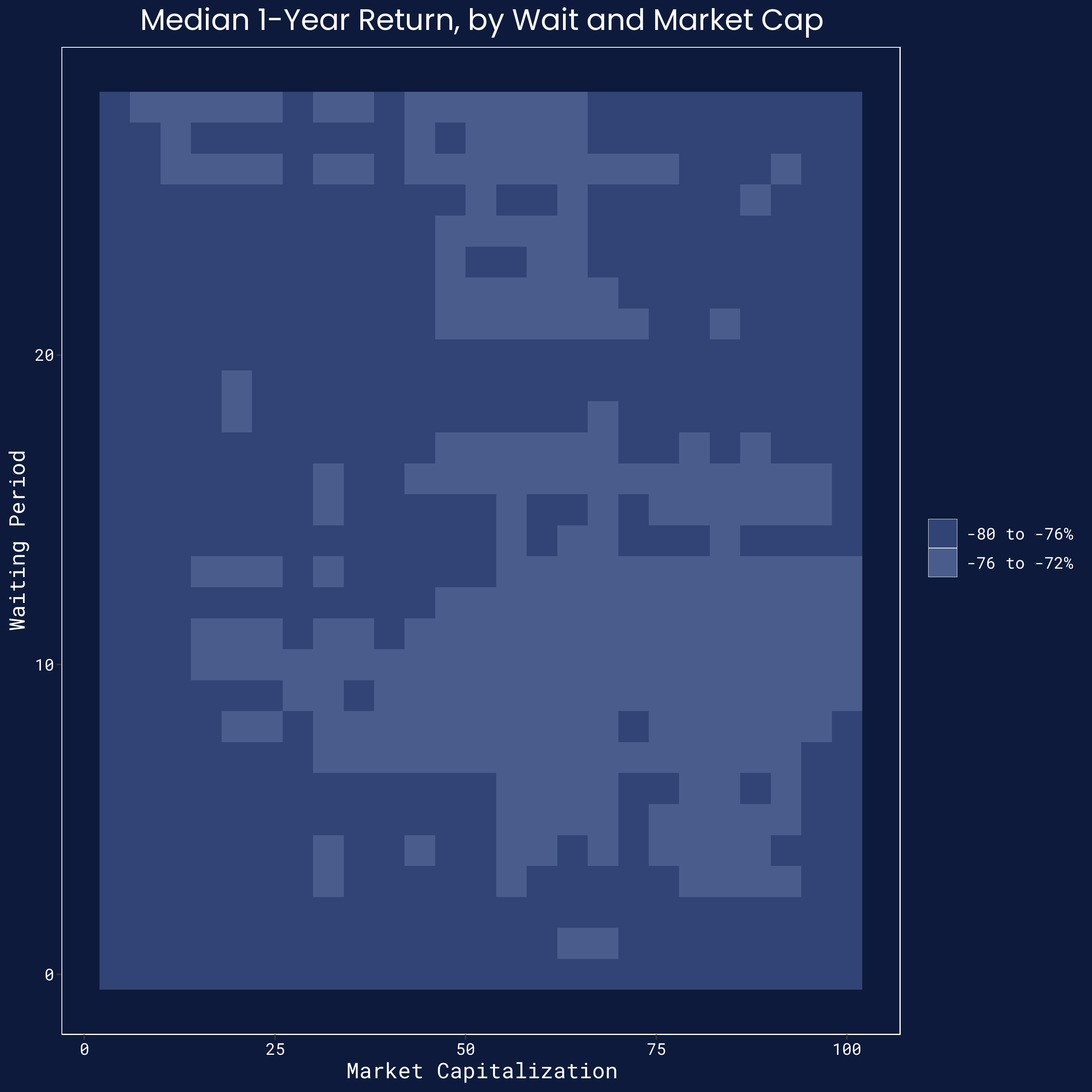 However, this argument has its limits. First, it is often tough to purchase tokens with very small market capitalizations. Such tokens are listed on tiny exchanges, and entail substantial execution costs to trade (particularly in meaningful size). Second, it is possible that the coverage of tokens at such early stages by Coingecko and Coinmarketcap is more imperfect, which would skew the results — although both do track tokens well below $10 million routinely. Third and finally, this result is entirely driven by getting into a very few tokens early. For instance, if we compute the same heatmap but utilize median rather than mean returns, virtually all portfolios yield the same result — median returns are around -75%, corresponding to about 80-85% of tokens being underwater at the one-year mark.