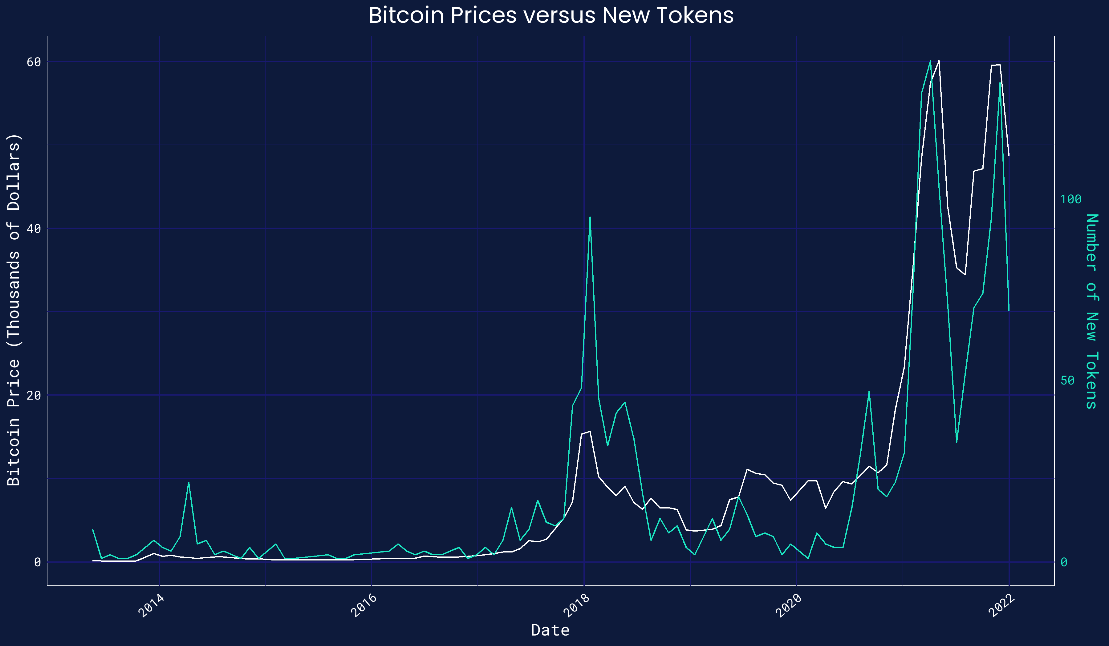 There does indeed seem to be some clear cyclicality in new token launches. To illustrate, we plot the monthly price of Bitcoin versus the number of new tokens that launch (via our standard threshold of market capitalization). The graph below shows that the two closely track one another!