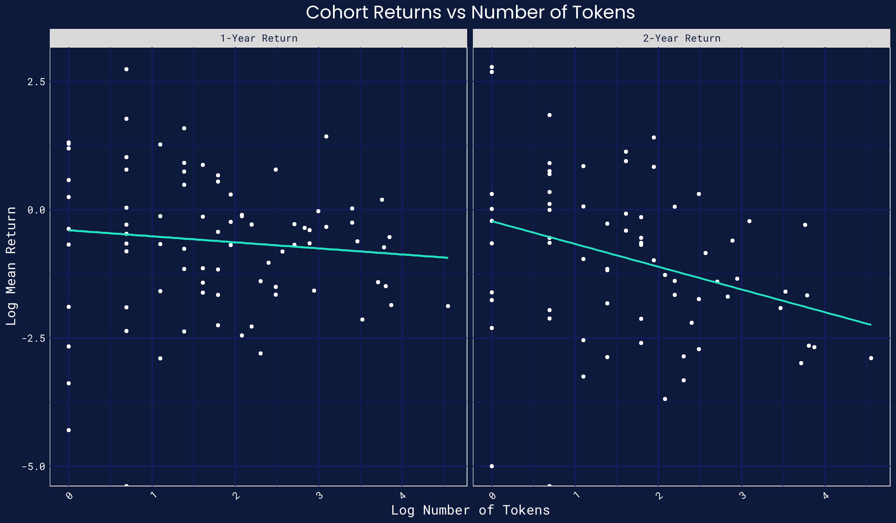 These results — particularly the baseline one — seem counterintuitive, but consider some visual evidence. We present below a scatterplot of the gross returns, at the one- and two-year horizon, in logarithmic terms versus the number of tokens in logarithmic terms, for each thirty-day cohort.[5] As the graph and the corresponding best-fit line show, there is really no relationship in the data at the one-year horizon. There is a weak relationship at the two-year horizon, but it is not particularly tight or impressive.