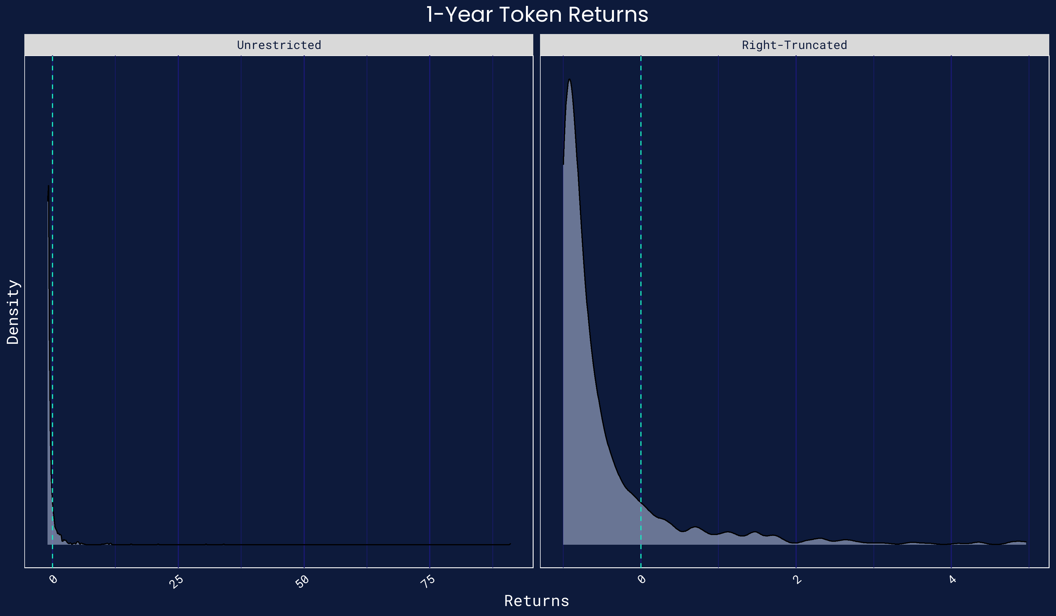 Indeed, we can visualize the heavy skew in token returns by presenting the density plot (i.e. histogram) of returns below. The left pane represents all tokens, while the right pane focuses only on returns up to +500% for enhanced clarity.