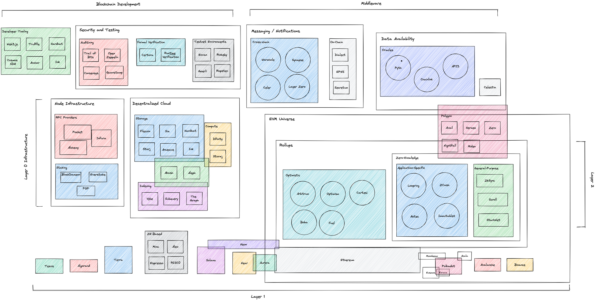 With the rapid emergence of cross-chain bridges, new testing frameworks, and other crypto protocols, effectively mapping out blockchain infrastructure remains a key challenge for users, developers, and investors alike. The term “blockchain infrastructure” can encompass a variety of different products and services, ranging from the underlying networking stack to the consensus model or virtual machine. We reserve a more in-depth analysis on the various “core” components that make up L1/L2 chains for a later post (keep your eyes peeled!). In this piece, we specifically aim to: