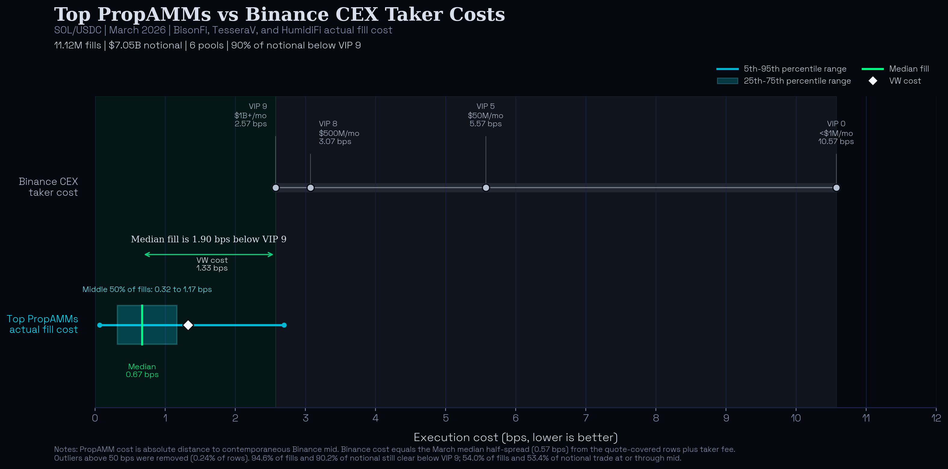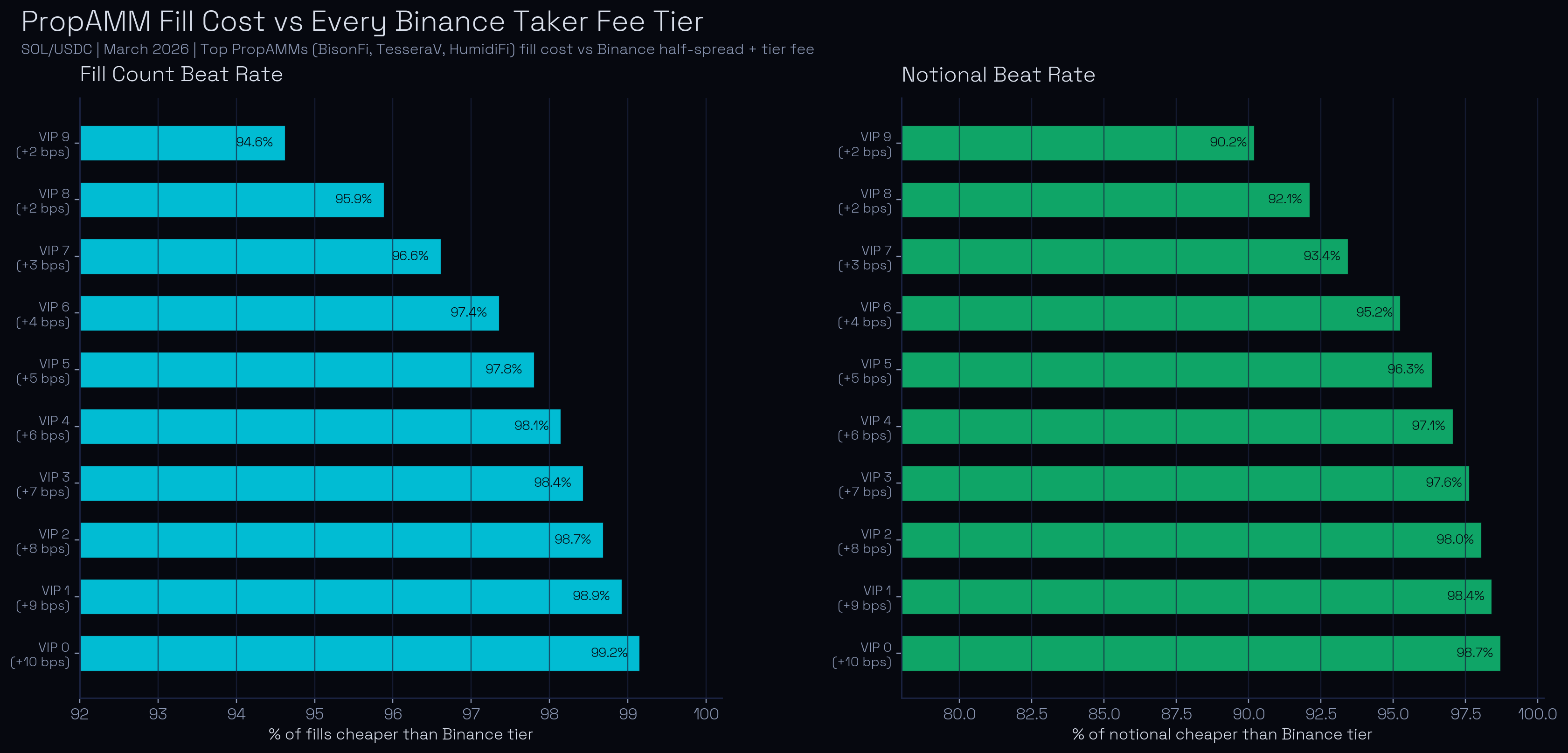 Across the top PropAMM cohort on Solana, the median SOL/USDC fill executed 0.67 bps from Binance mid. A Binance taker, by contrast, pays the spread plus an exchange fee on every fill. Even at VIP 9, the most favorable tier available and one that requires over $1 billion per month in volume to qualify, the all-in cost is 2.57 bps. Against that line, nearly 94.6% of top PropAMM fills and 90.2% of notional cleared cheaper. For a retail trader at VIP 0, the all-in cost rises to 10.57 bps, and 99.15% of those top PropAMM fills beat it.