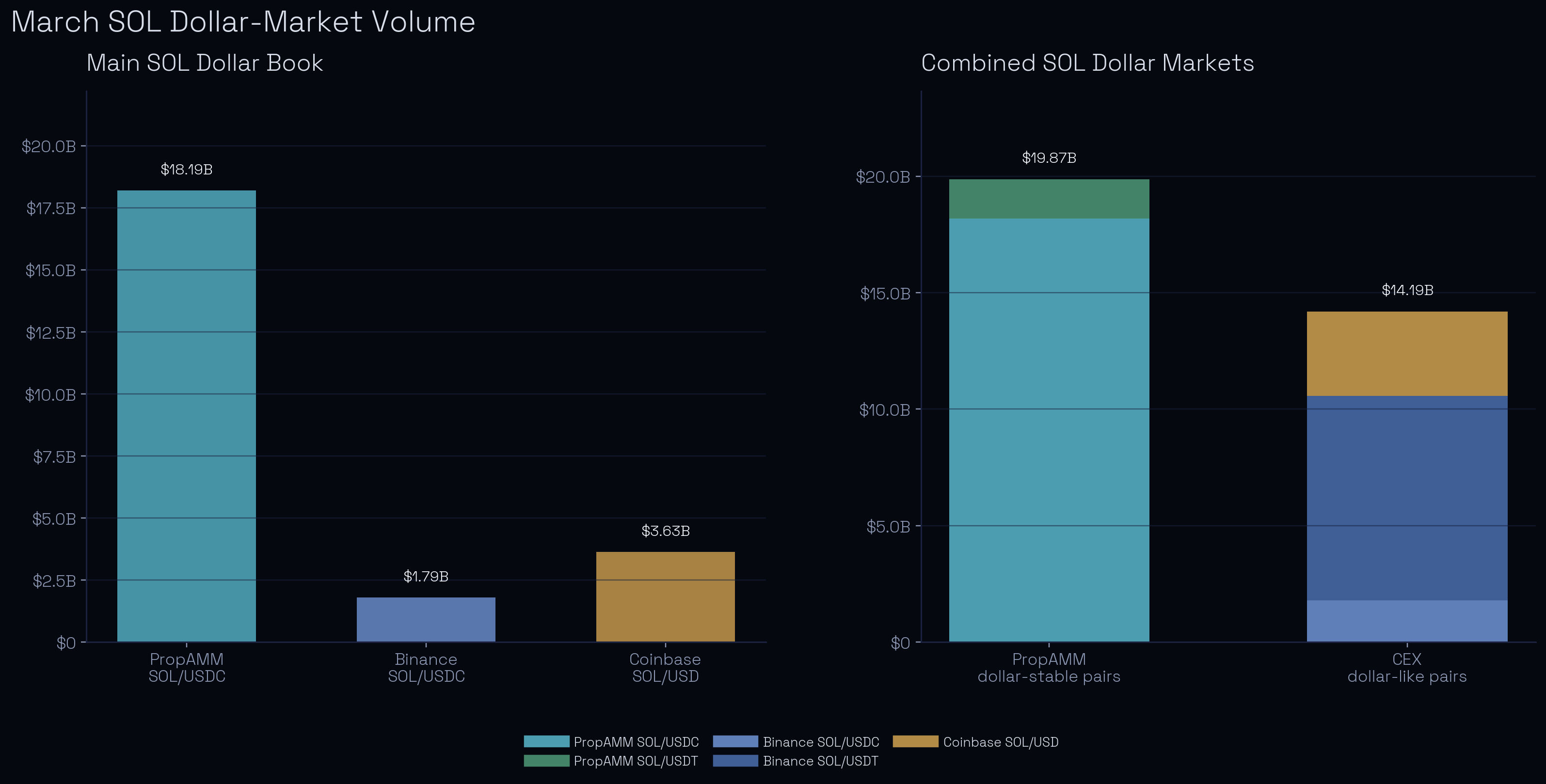 This wasn't some niche segment of the SOL spot market. Onchain volume for March across the top PropAMM cohort on Solana totaled $18.19 billion in SOL/USDC and $1.68 billion in SOL/USDT, for a combined $19.87 billion across the two pairs.