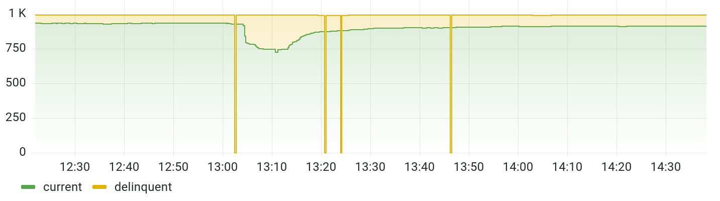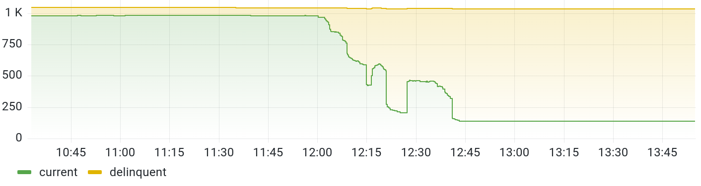 Unfortunately, the first restart attempt failed due to a very unlucky bug. During the first restart, it quickly became clear that something was amiss. Some nodes reported that the number of active stake reported by their nodes was jumping around wildly.