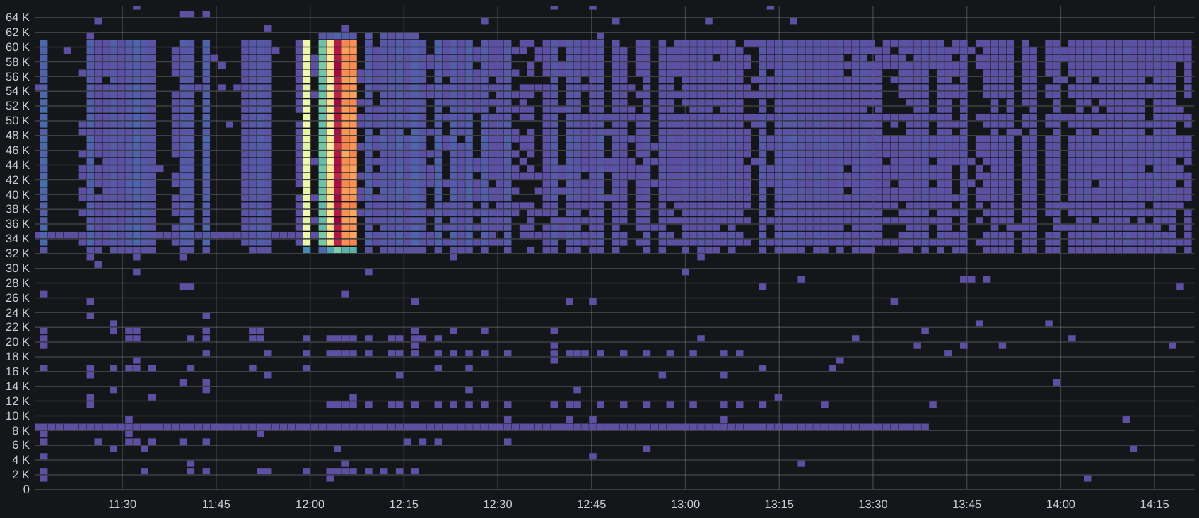 Looking at source port distributions, it is evident that this is client traffic evenly distributed across the >30k port range typically reserved for client applications, confirming that the majority of traffic were sent by one or many clients rather than forwarded by cluster nodes: