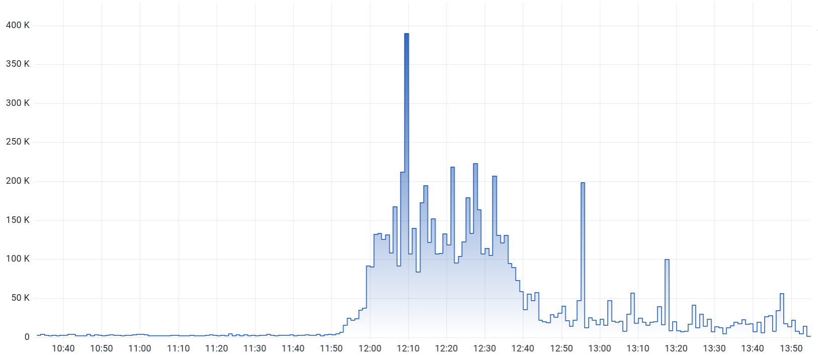 Right around 12:00 UTC, a massive flood of transactions sent by multiple bots hit the network, trying to win the race and outcompete each other—effectively, and likely unwittingly, executing a distributed denial of service attack on mainnet-beta.