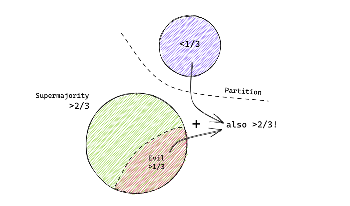 If 1/3+ of the network were evil (the "byzantine" in Byzantine Fault Tolerance) and able to censor network packets, they could sign two blocks for the same slot, and show one half of the network one block and another block to other half, leading to two separate 2/3+ majorities and two valid conflicting blocks causing double spends (and possibly the awakening of Chtuhl̷u). It must never, ever happen!