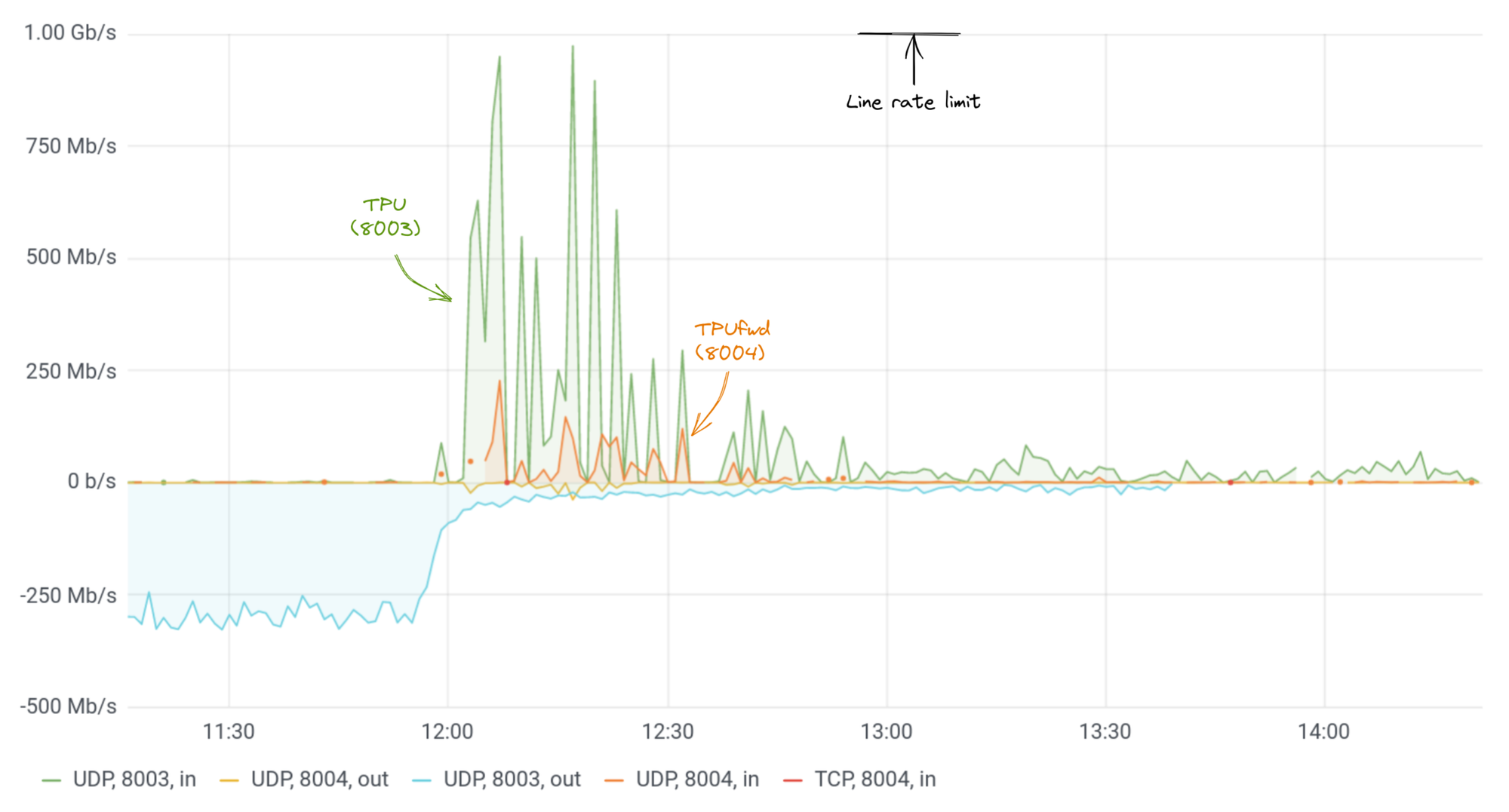 Indeed, according to monitoring data provided by the hosting company Marbis (thanks!), the volume even exceeded physical interface capacity at times, causing some traffic to be dropped on the switch port before it even reached our validator.