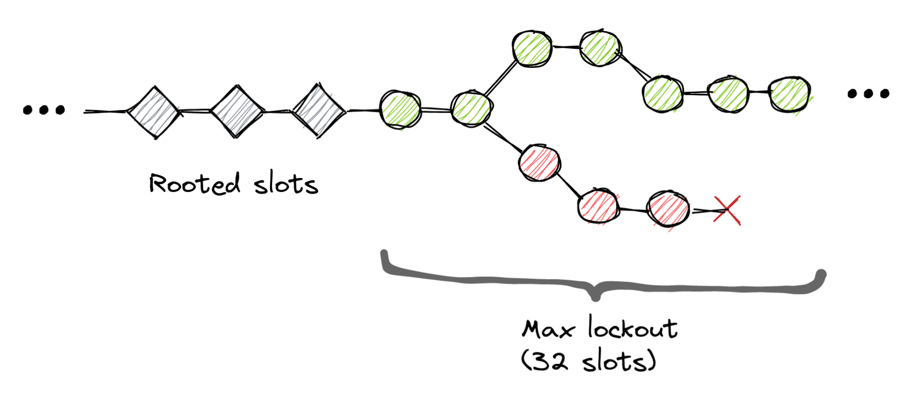One of Solana's key innovations is the use of Proof of History—a technique closely related to verifiable delay functions—to establish a cluster-wide clock, allowing the network to fast-forward over slots which belong to slow or unresponsive leaders, without having to wait for a synchronous round of consensus. When voting on a fork, leaders commit to them for a specific period of time (called the lockout period, currently 32 slots).