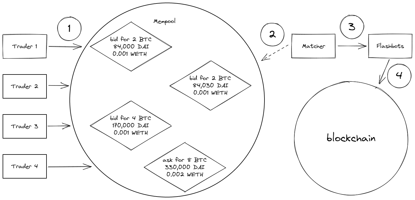In this example, four traders submit orders to the and the matcher leverages Flashbots for bundled execution.