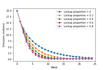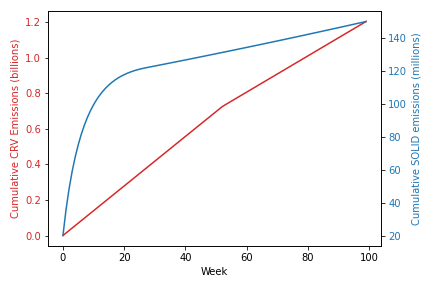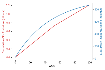The shape of the above emissions curves is markedly different. Even under the most conservative lock assumptions, a significant majority of the total emissions accrued over 100 weeks is emitted in the first 10 weeks.