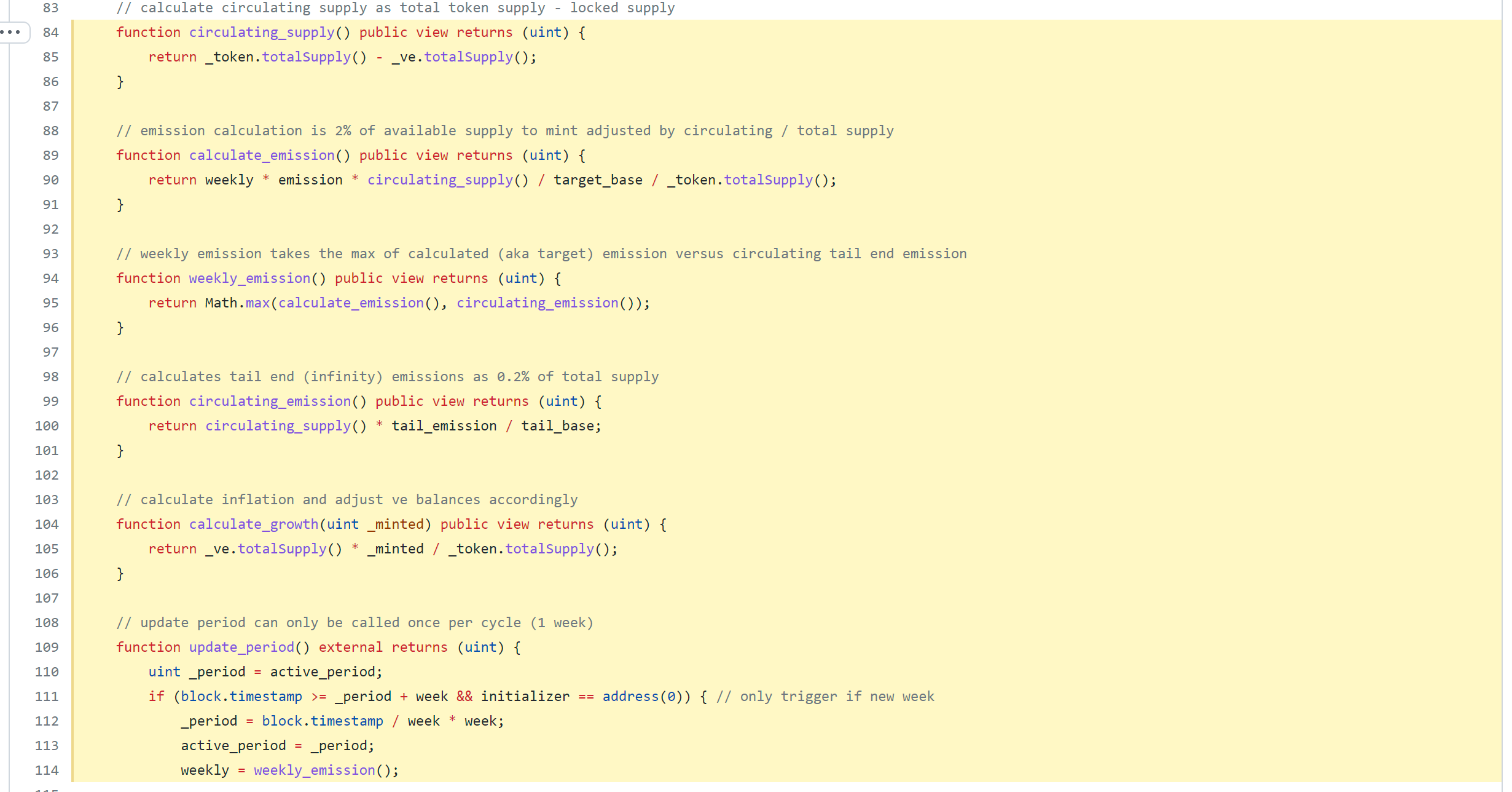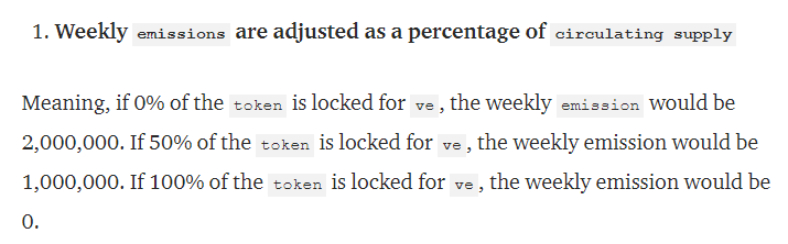 weekly) by the aforementioned 2% decay (emission/target_base) and the ratio of circulating supply to total supply (circulating_supply()/_token.totalSupply()). - Line 114 sets the new supply cap for the next week to this week’s emission