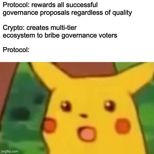 - This third benefit is sometimes missed by protocols that utilize the one token/one vote model, as a handful of whales can effectively turn such protocols into oligarchic structures. One might consider this a form of "soft rug." ↩︎