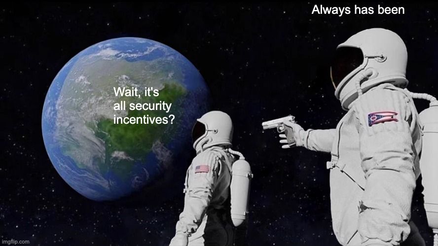 While staking remains an effective mechanism, there is still room for improvement. In particular, staking is commonly done entirely in the chain’s native token. In extreme cases, this runs the risk of a "doom loop" where a fall in the token’s price leads to reduced security, which leads to a further fall in the token’s price, etc. (See, for instance, the preemptive halting of the Terra chain on May 12 after the fall in LUNA’s price sparked concerns around the ease of an attack.) In such cases, staking would fail to deliver the common good and align value correctly.