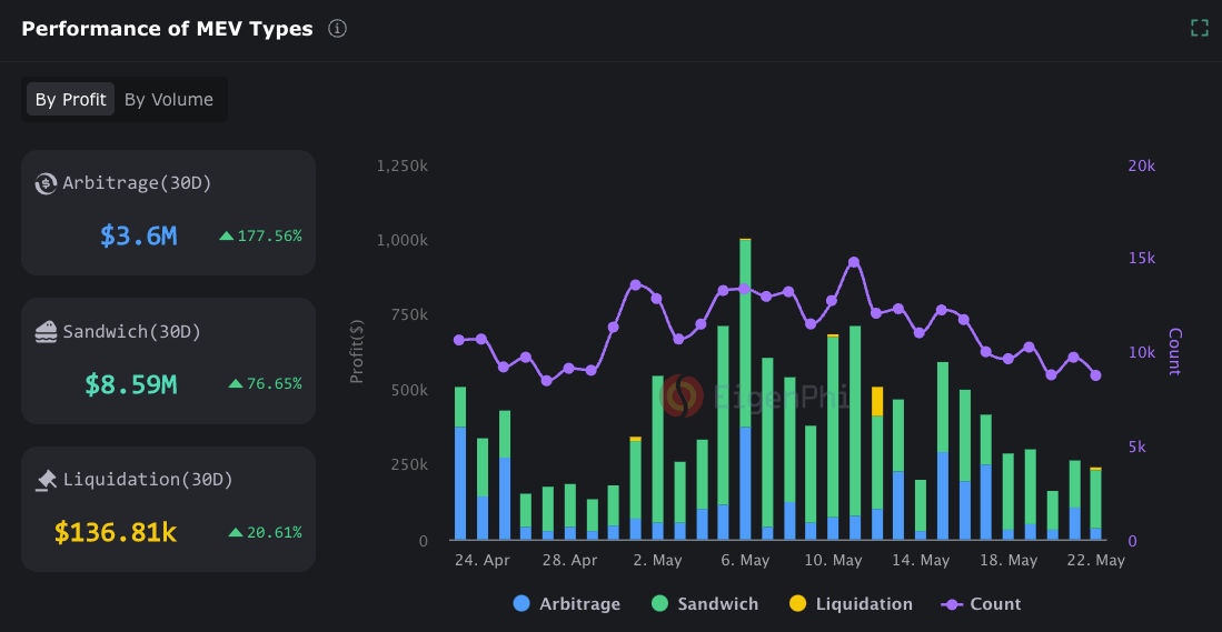 “Sandwiching,” the practice of extracting value created by a swap or similar operation by surrounding it with trades on the same assets, remains a major issue for transactions submitted openly via the mempool. Researchers at Eigenphi estimate sandwiches have yielded over $8 million in 30-day profits on Ethereum alone, which constitutes the bulk of all on-chain “maximal extractable value” or MEV.